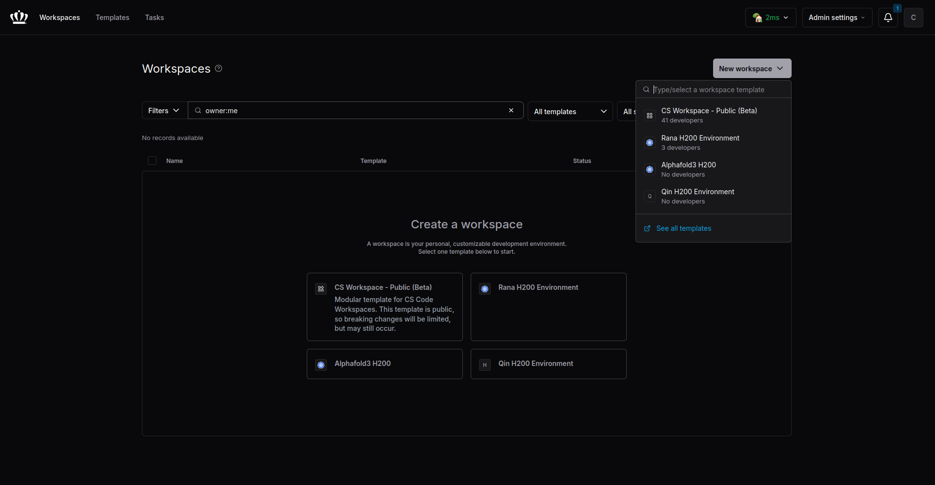 Click the "New Workspace" button in the corner and select an available template.